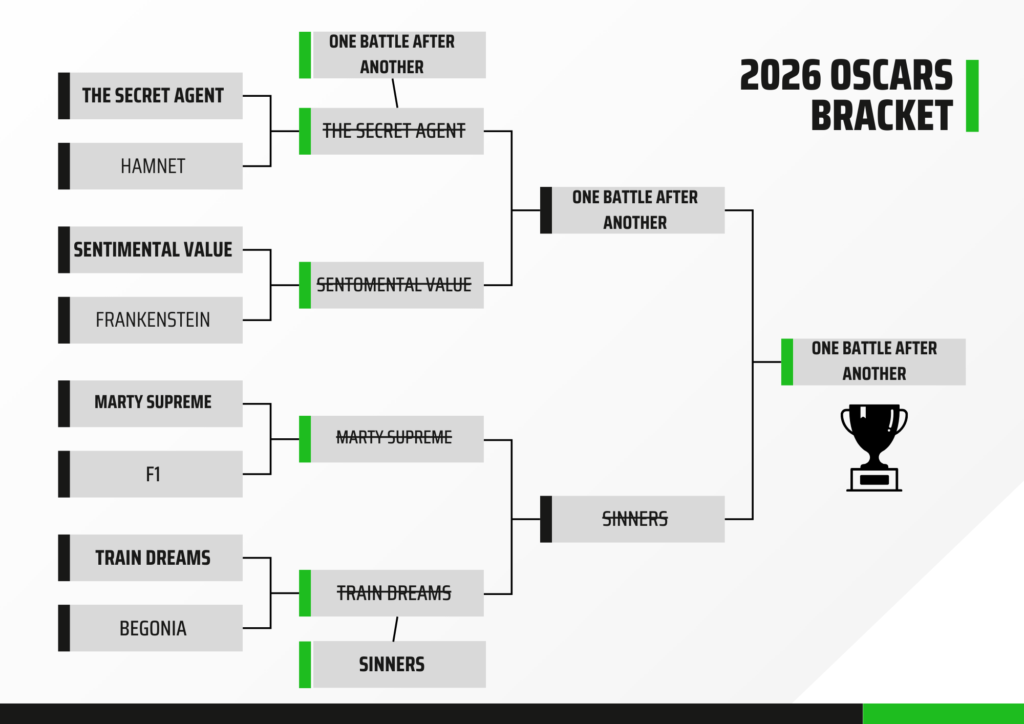 One Battle After Another vs. Sinners. That’s what this race comes down to. Despite recent signals pointing to Sinners having a real chance to win, I have to stick with my gut here. One Battle was the best movie I saw this year, last year, and maybe the year before. Sinners was spectacular and a thrill ride, and while also deserving, this is One Battle’s year.